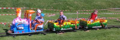 Lokomotywa z wagonikami Mini Express to sprzet dla najmłodszych uczestników imprez plenerowych.